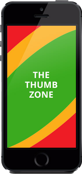 The majority of people, and thus, smartphone users are right handed, and certain areas of the screen are faster and easier to reach using the right thumb than other areas. It's best to make your targets big so they're easier for users to tap. Simplifying navigation in this manner will quell some headaches and keep possible irritated customers who prefer using their devices one-handed from bolting. The image below outlines the easy, medium and harder areas for quick and efficient usability. Any elements that fall outside of what's a natural stretch for the hand are best used for design rather than navigation.